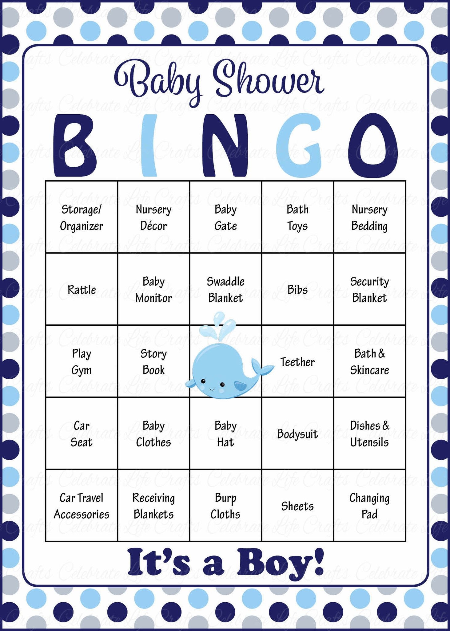 Whale Baby Bingo Cards Printable Download Prefilled Baby Shower Game For Boy Navy Gray Polka Dots B15007