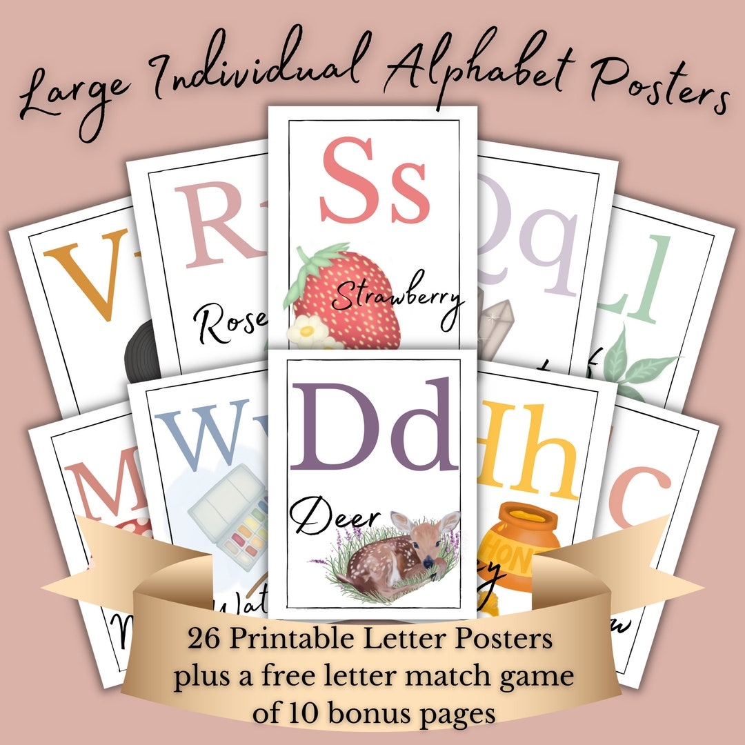 Each poster features a large, easy-to-read letter along with a corresponding image to help reinforce letter recognition. Hang them up in your child’s bedroom, playroom, or homeschool area for a fun and decorative way to encourage learning.
