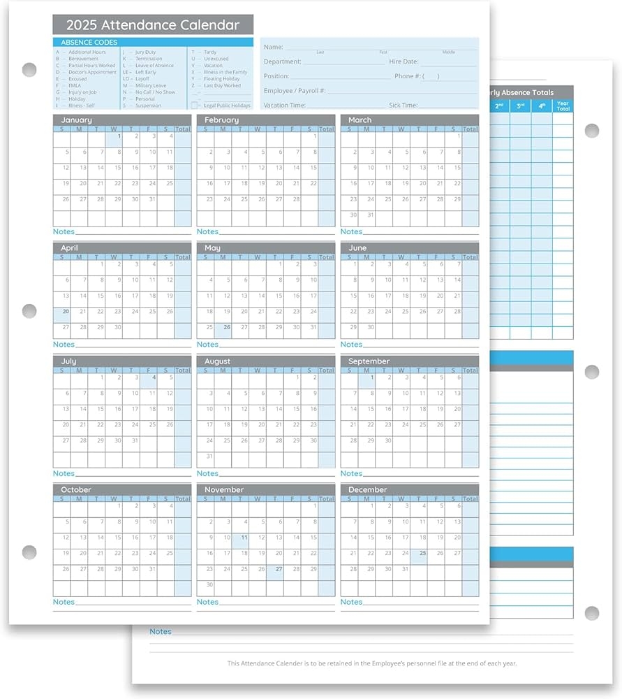 Blue Summit Supplies 50 Sheet Attendance Calendar Employee 2025 Attendance Sheets For 3 Hole Binder Convenient Tracker For Employee Attendance