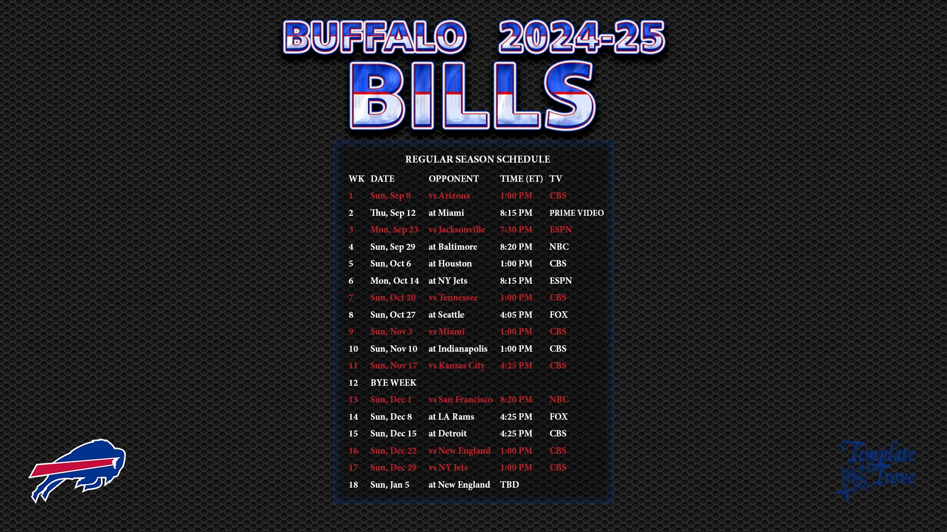 Don’t miss out on any of the Buffalo Bills’ exciting games this season. Download our free printable schedule today and gear up to cheer on your favorite team to victory. Go Bills!
