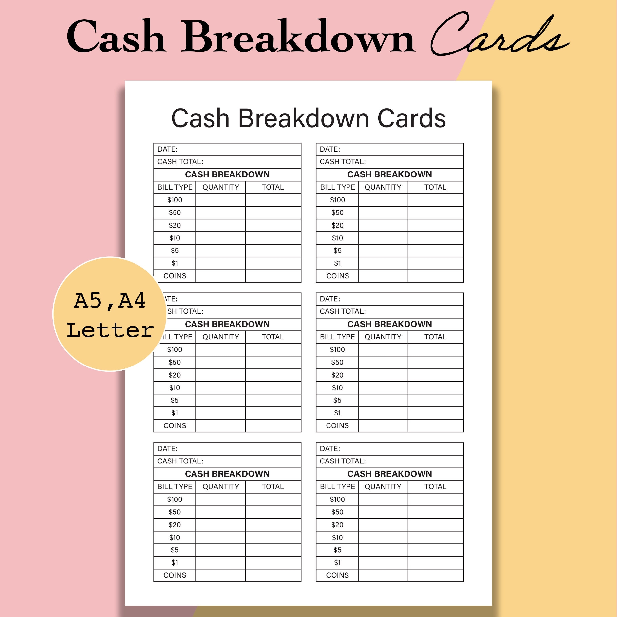 Cash Breakdown Count Sheet Printable Cash Breakdown Cards PDF Cash Withdrawal Slip Money Envelope A5 A4 Letter Digital Download Etsy