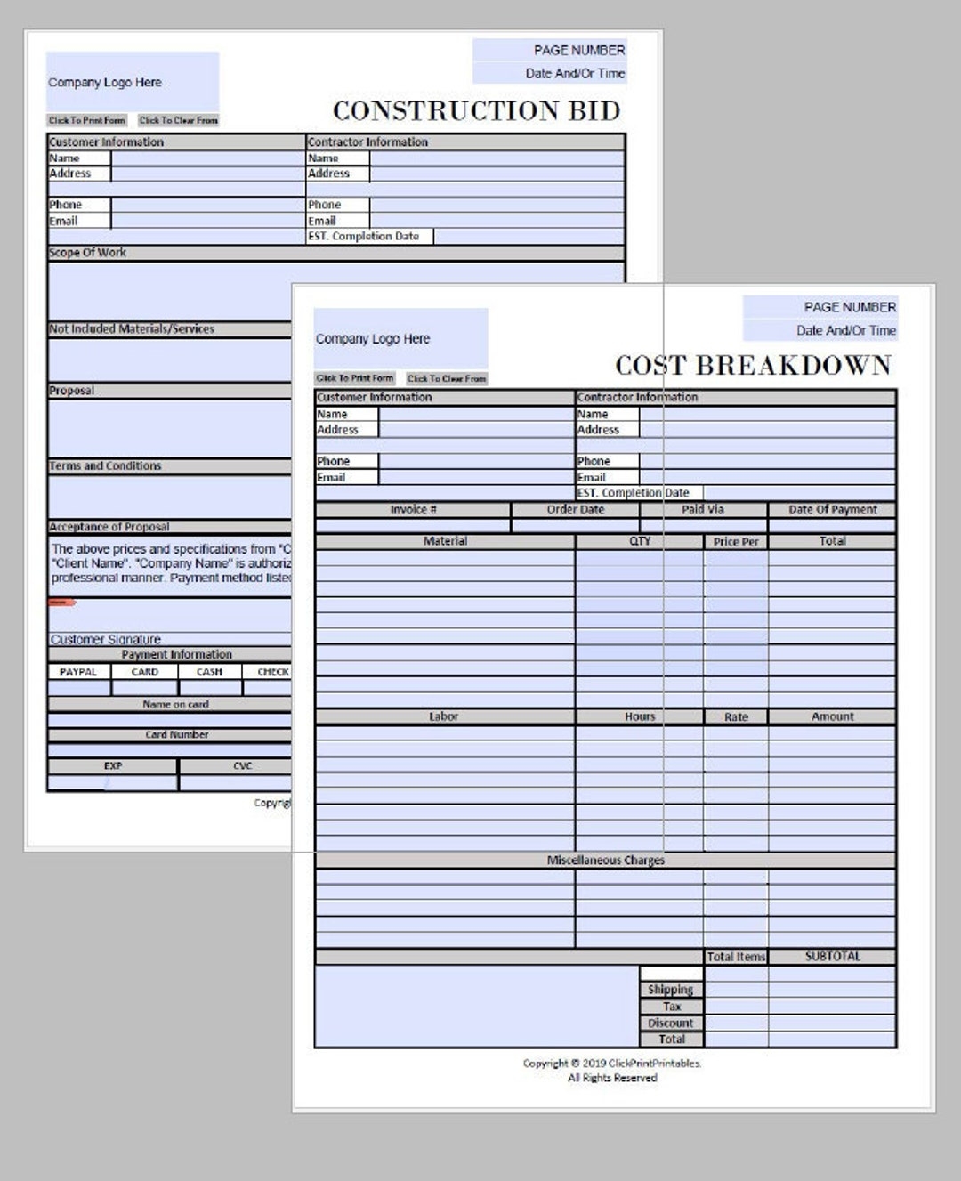 Construction Bid Project Form With Cost Breakdown Template Editable Downloadable Printable Small Business Fill In PDF black And White Etsy
