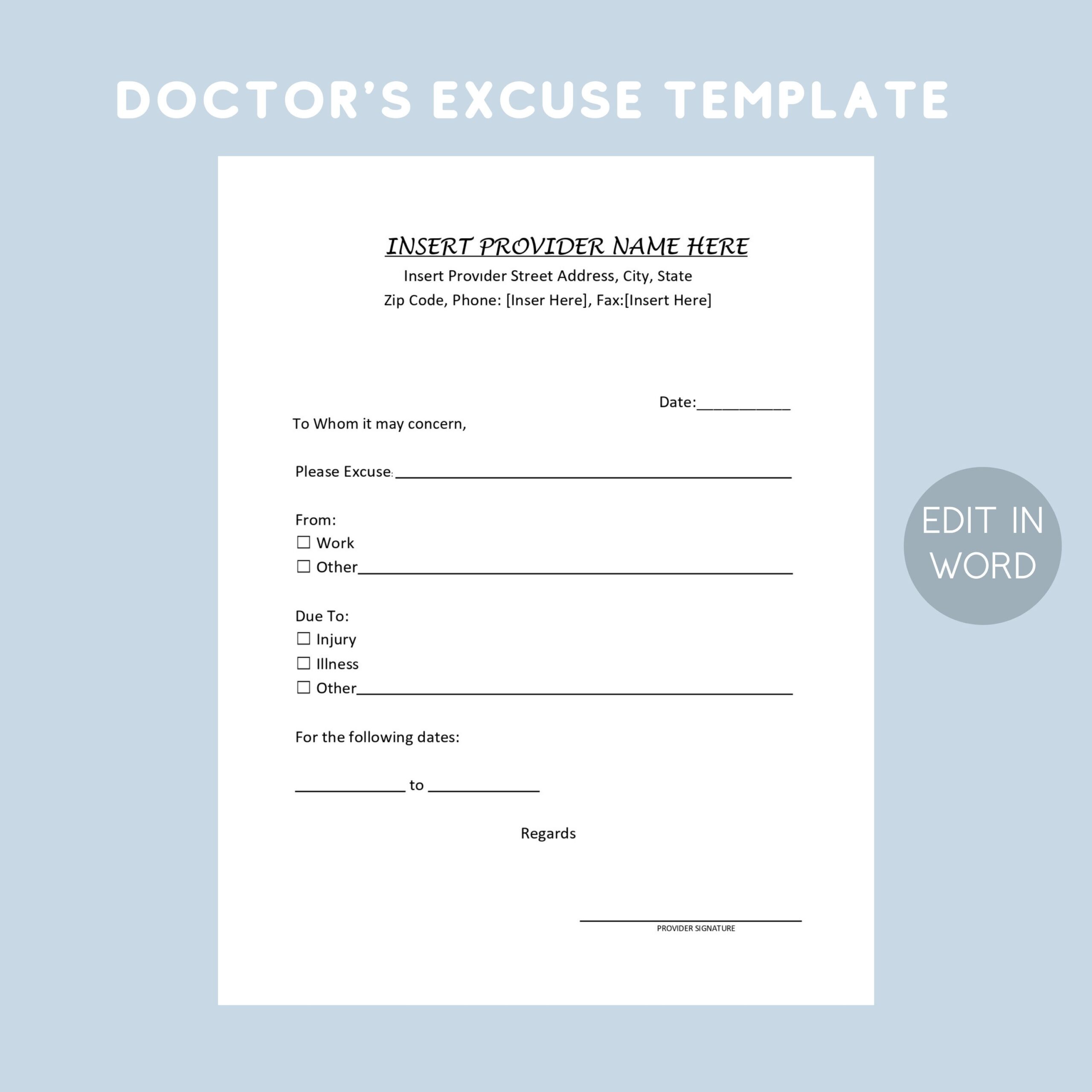 Printable Doctors Excuse Template EDITABLE Medical Office Forms