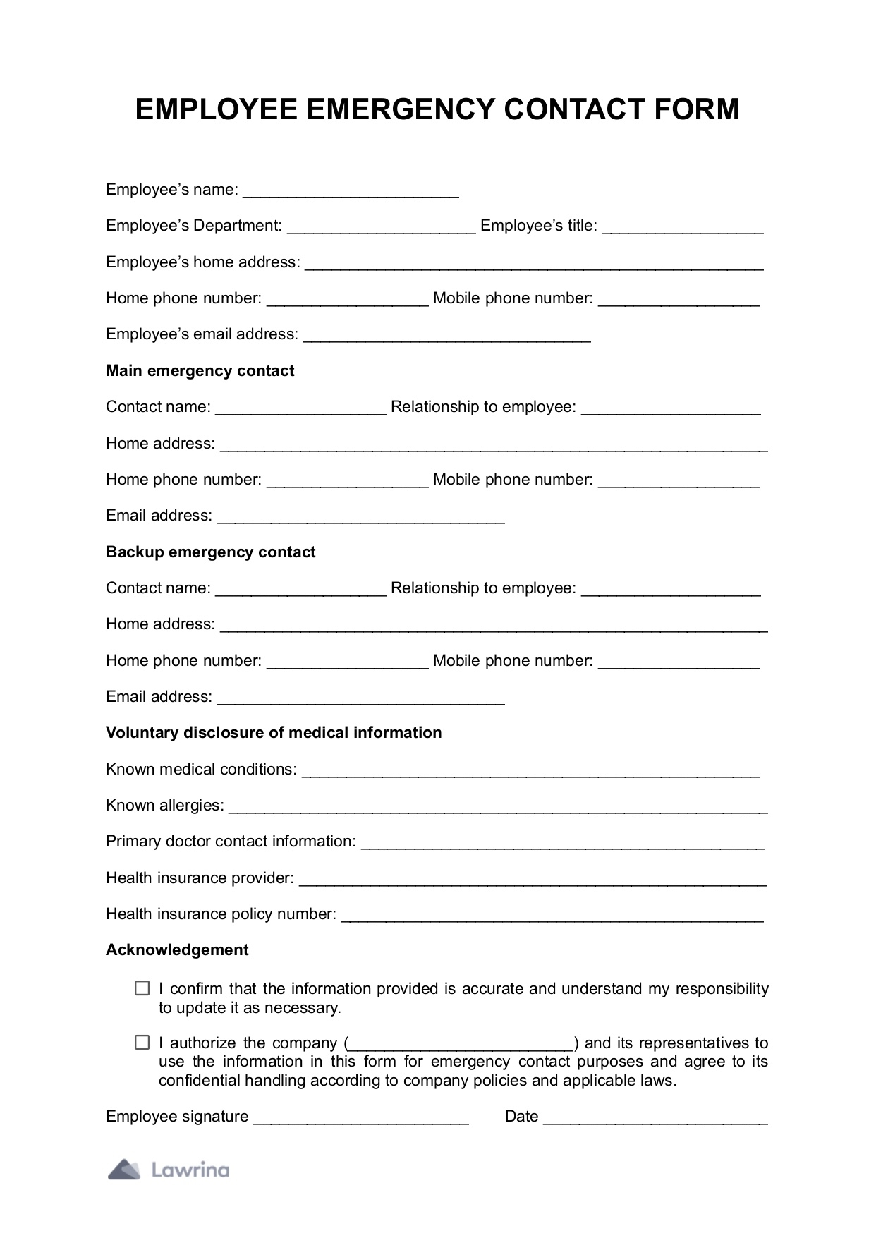 Free Printable Emergency Contact Form Templates for Employees PDF U0026 Word
