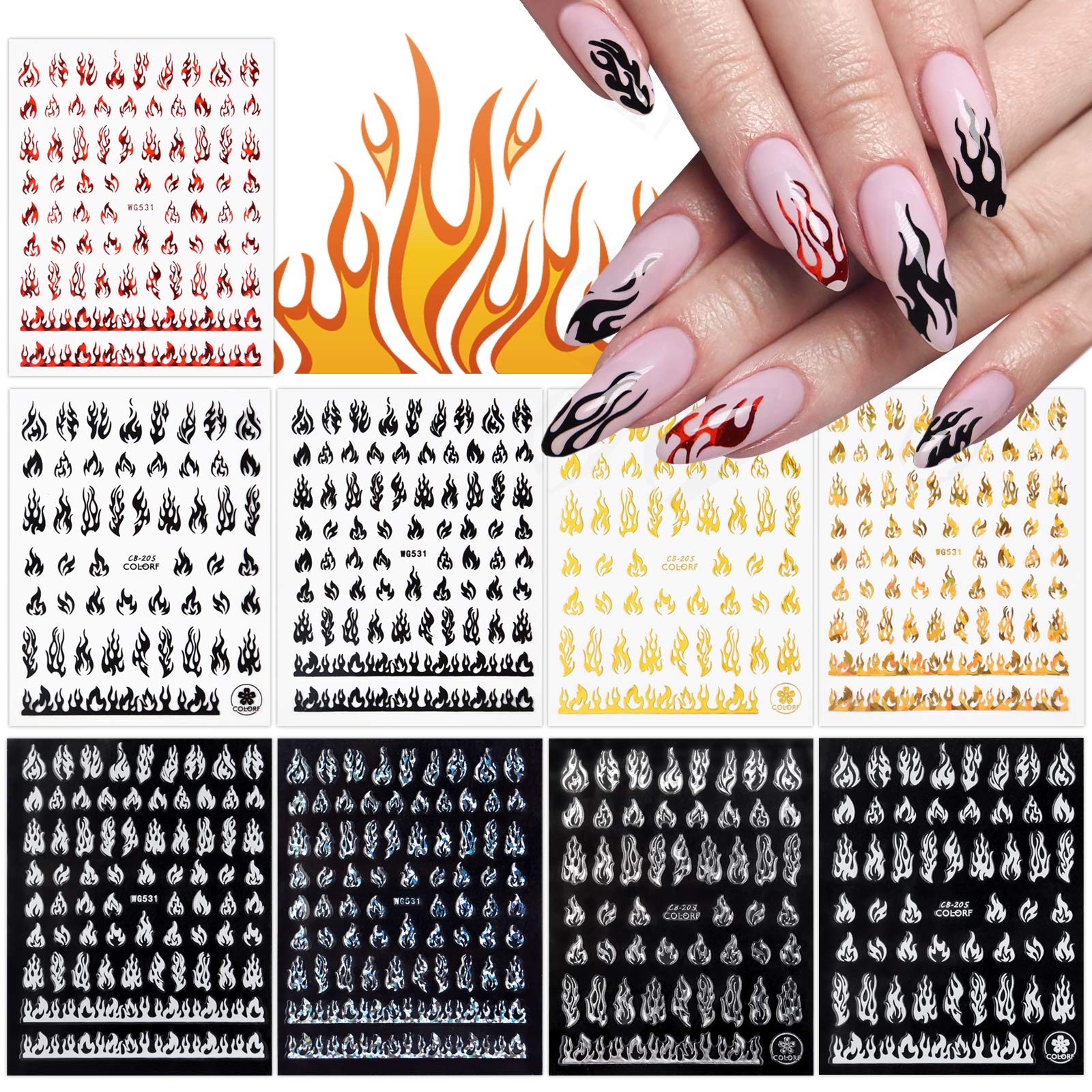 Amazon 9 Sheets Flame Nail Stickers Decals TOROKOM 3D Holographic Self Adhesive Fire Nail Decals White Black Silver Gold Red Flame Nail Art