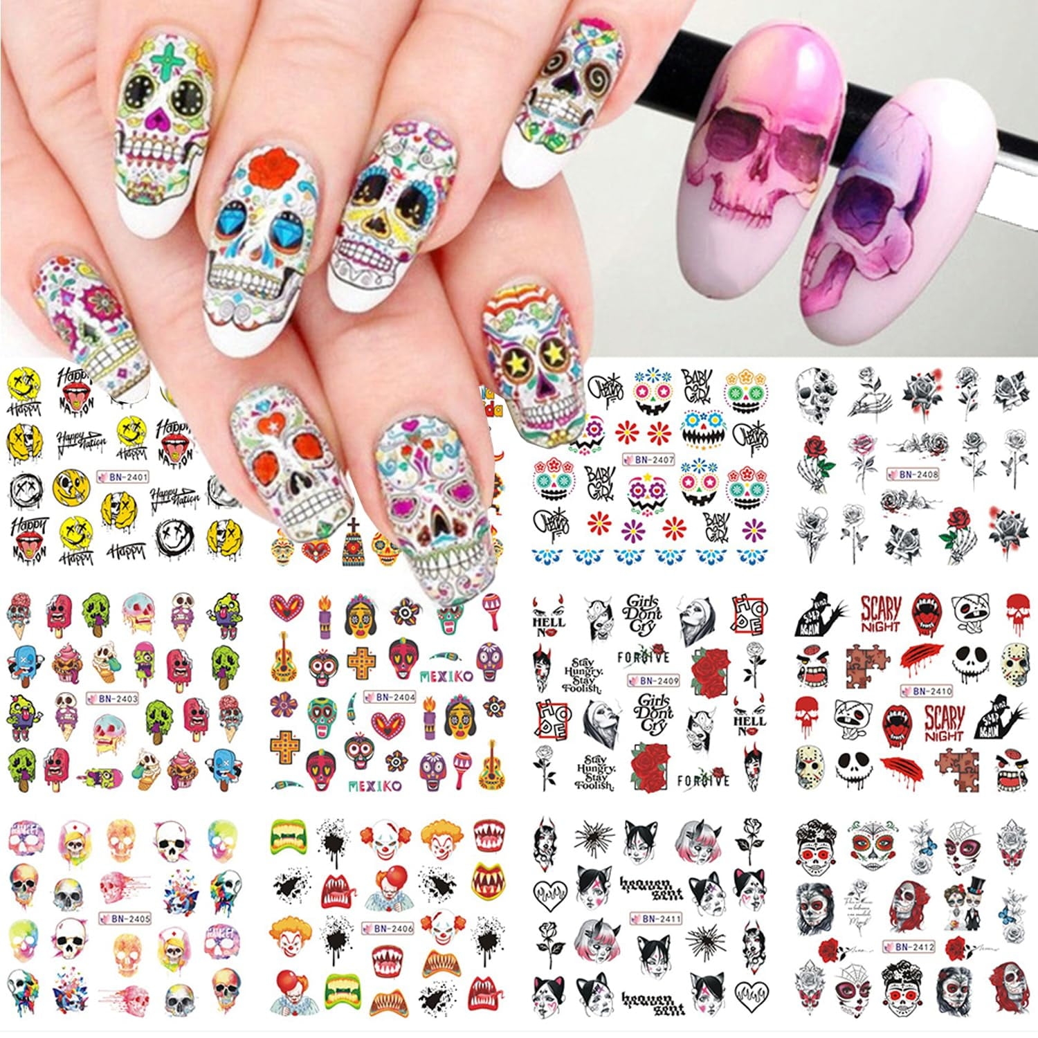 Halloween Nail Art Stickers Halloween Nail Water Decals Grimace Specter Nail Stickers Skull Foil Transfer Sliders Skeleton Ghost Witch Clown Design Nail Art Supplies For Women Nail Decorations 12Pcs Walmart ca