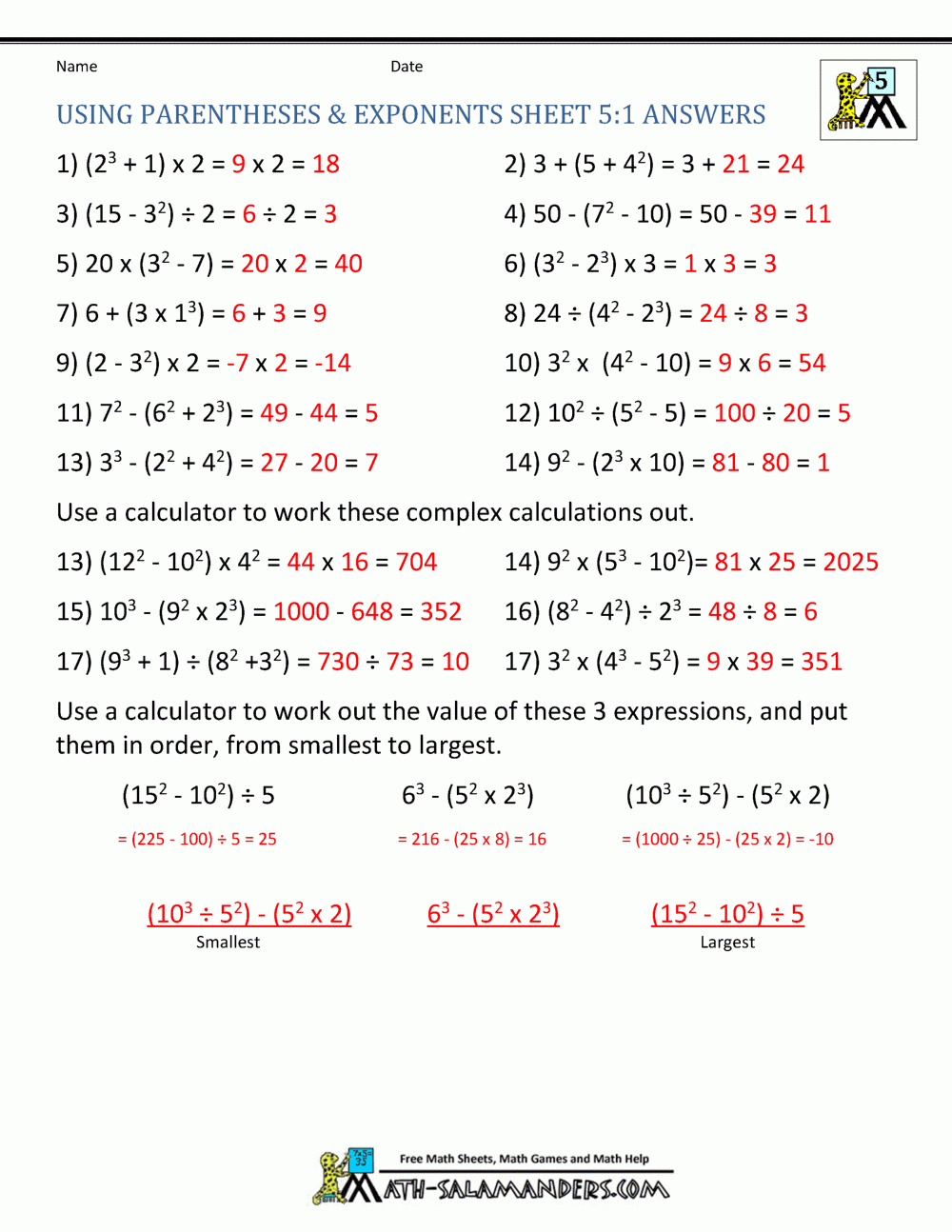 Free Printable PEMDAS Worksheets