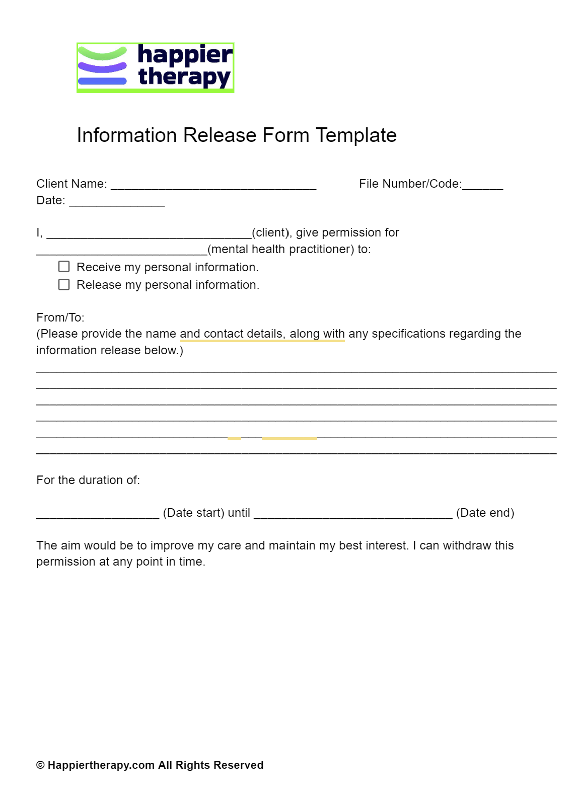 Release Of Information Consent Form Template For Private Practice Therapists And Counselors Etsy