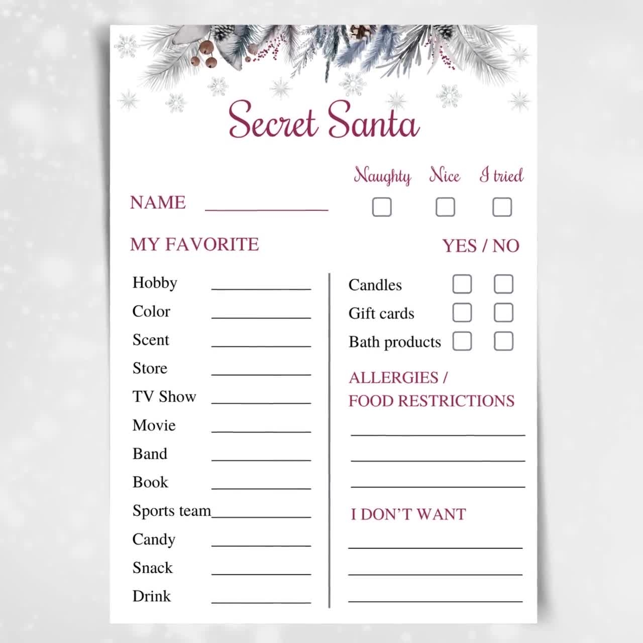 Printable Secret Santa Questionnaire For Work Or Family Holiday Party 5×7 Christmas Wish List Gift Exchange Activity INSTANT DOWNLOAD Etsy