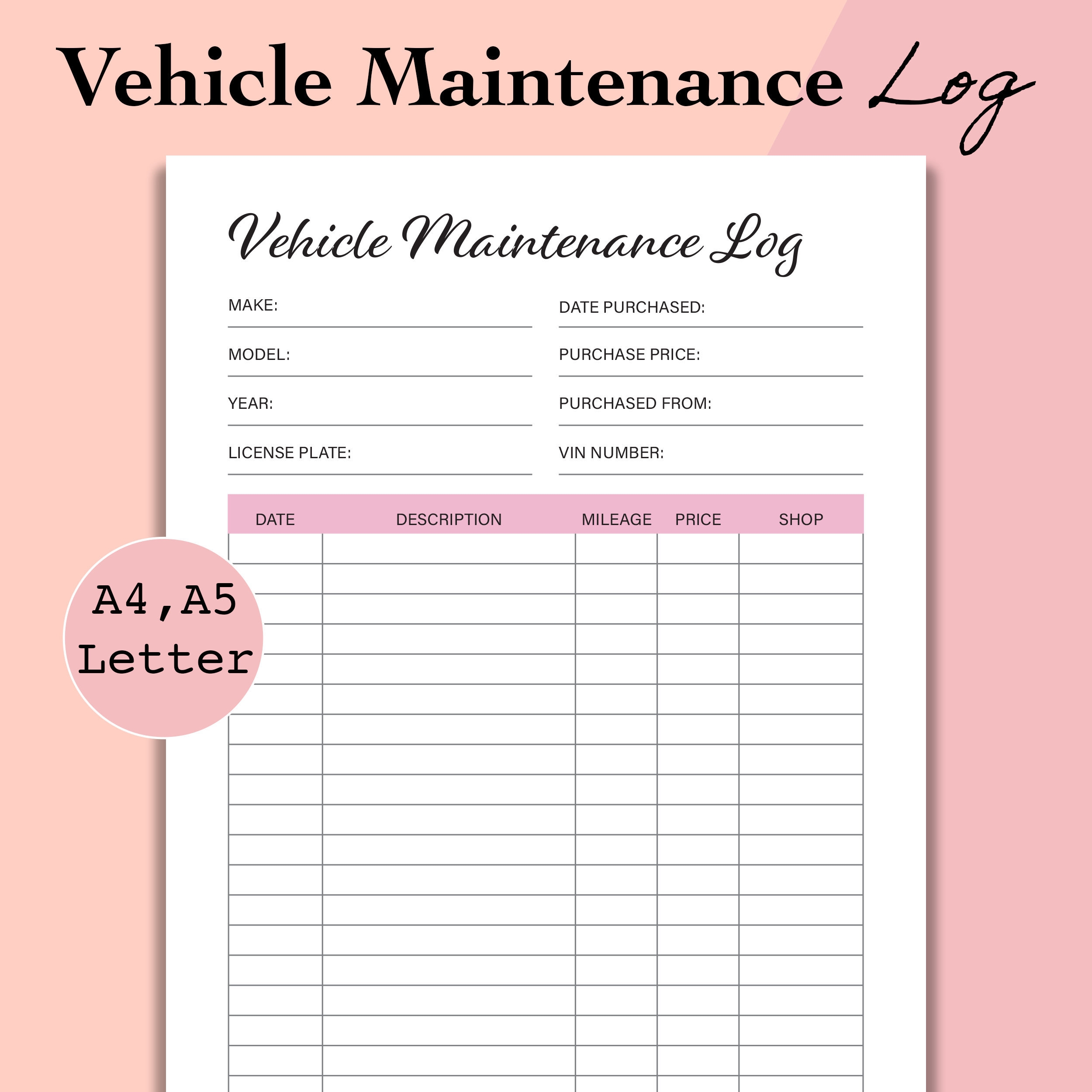 Vehicle Maintenance Log Printable Vehicle Service Tracker